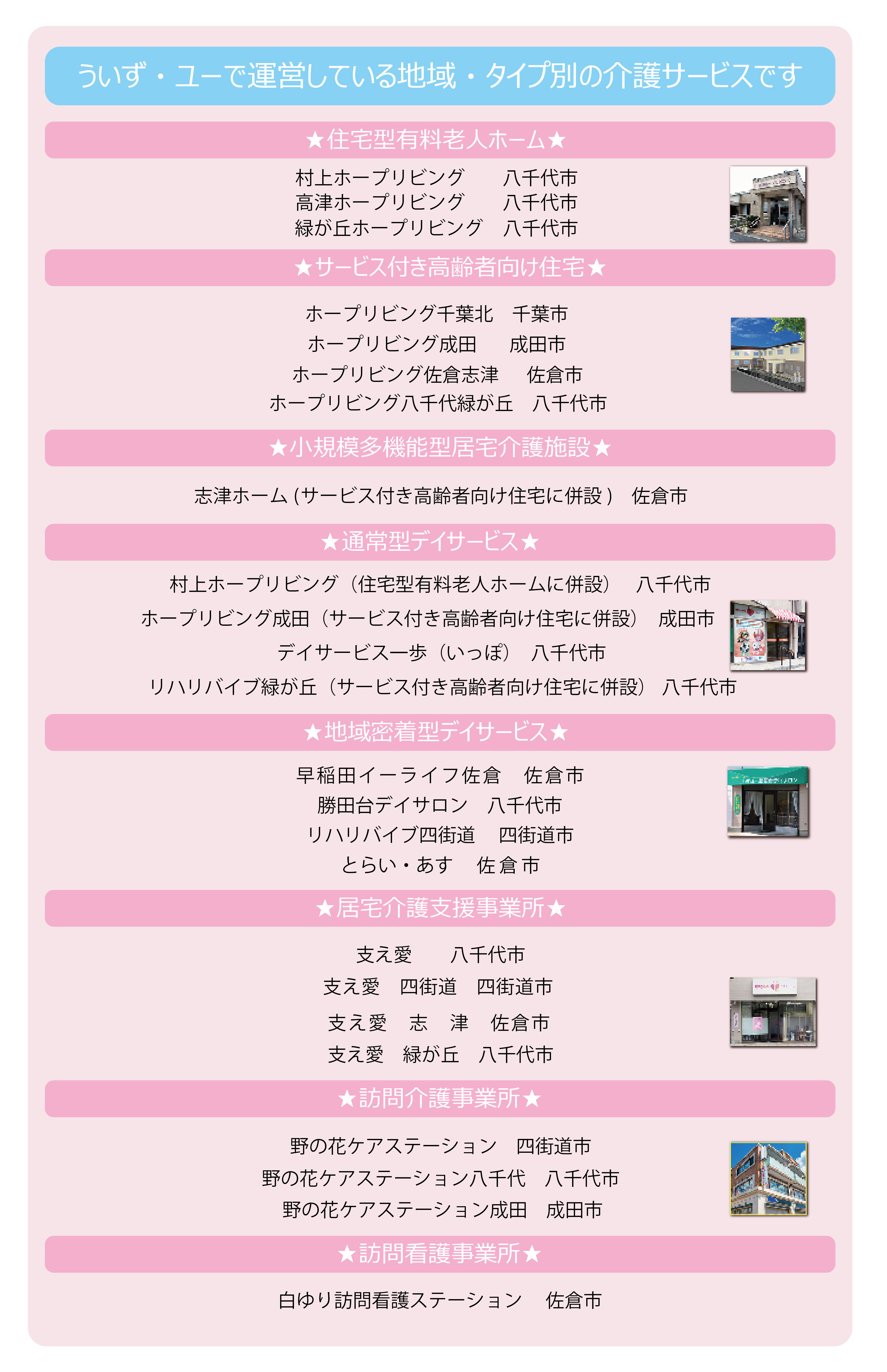 ●令和4年6月「支え愛緑が丘」が移転、連携していた「訪問介護ステーション」が併設となり名称を「野の花ケアステーション八千代」に変更。